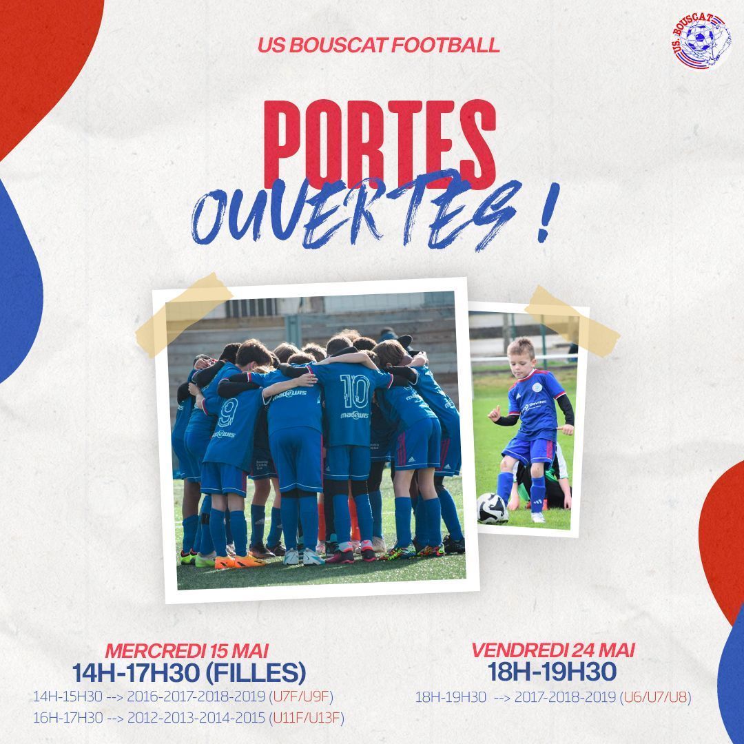 CONTACT : Mr CAUBIT Michael - rtjusbouscatfootball@gmail.com U7 (2018) : Vendredi 24 mai de 18h à 19h30