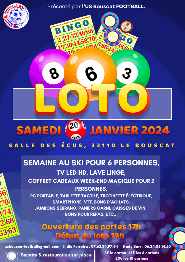 Samedi 20 Janvier 2024, la salle des écus du Bouscat ouvrira ses portes pour vous offrir la possibilité de remporter de nombreux lots !