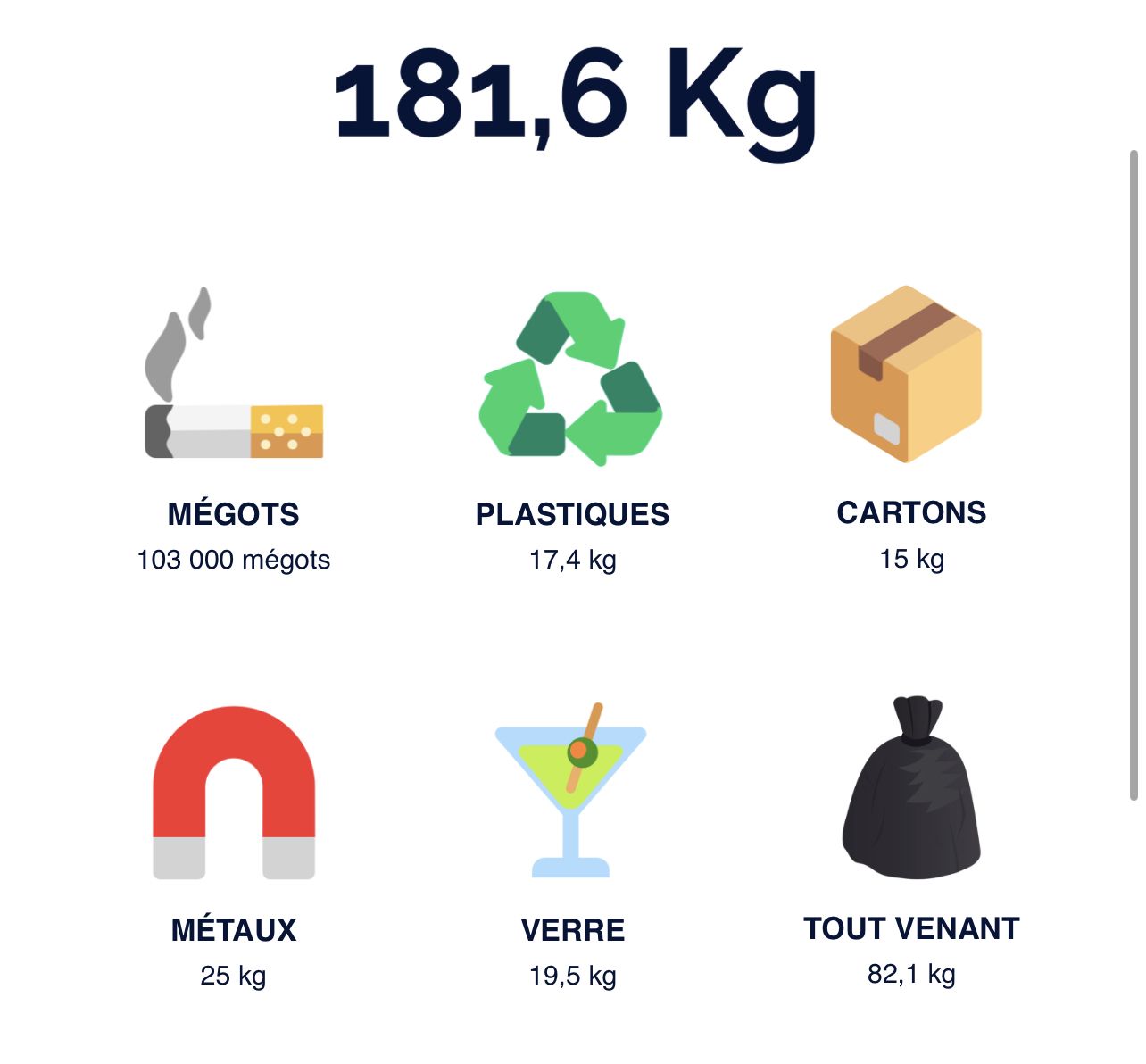 Durant cette marche d'environ 2h, les participants ont pu ramassé au total 181,6 KG de déchets repartis comme suit :