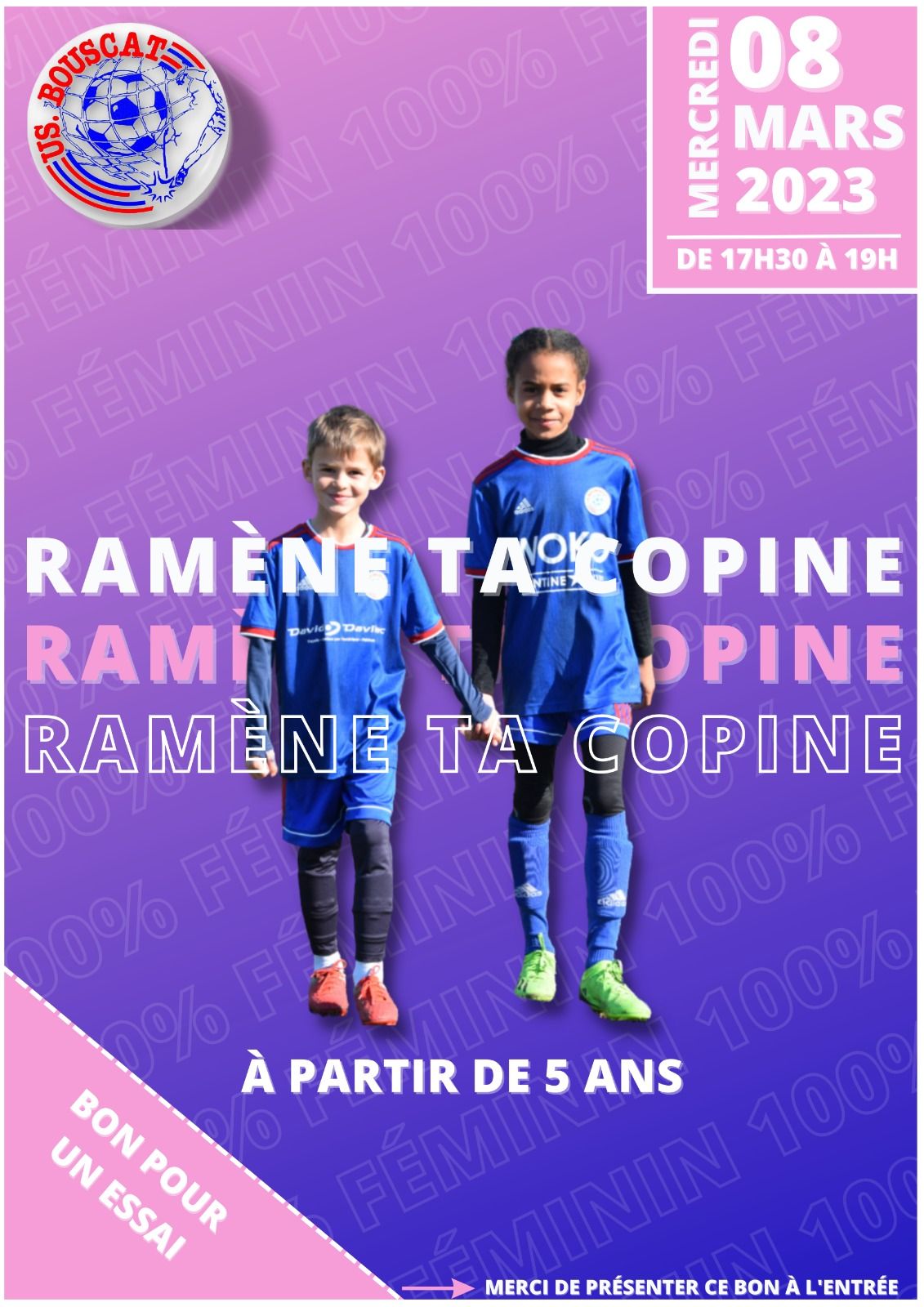 Ce bon est destiné à toutes les filles nées entre 2013 et 2017 souhaitant effectuer un essai pour une séance 100% filles le mercredi 8 mars de 17h30 à 19h aux Écus, en vue de la création d'une école de foot féminine pour la prochain saison.