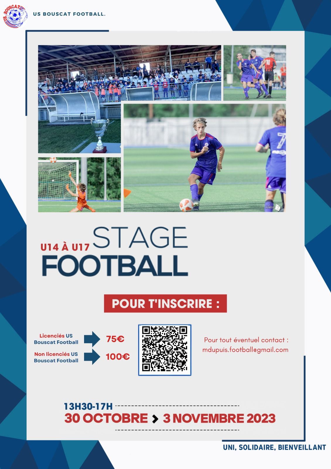 L'US.Bouscat Football organise un stage de perfectionnement de football destiné aux jeunes nés entre 2007 et 2010 du 30 octobre au 03 novembre 2023 de 13h30 à 17h au stade des Ecus.