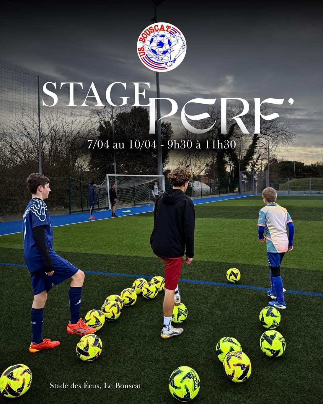 L'US BOUSCAT organise un stage de perfectionnement de football du 7 au 10 avril 2026 à l'attention des jeunes nés entre 2008 et 2012. Ce stage est ouvert à tous les jeunes du club ainsi qu'aux jeunes non licenciés ou venant de clubs voisins, il a lieu de 9h30 à 11h30 durant 4 jours sur le terrain synthétique des Ecus.